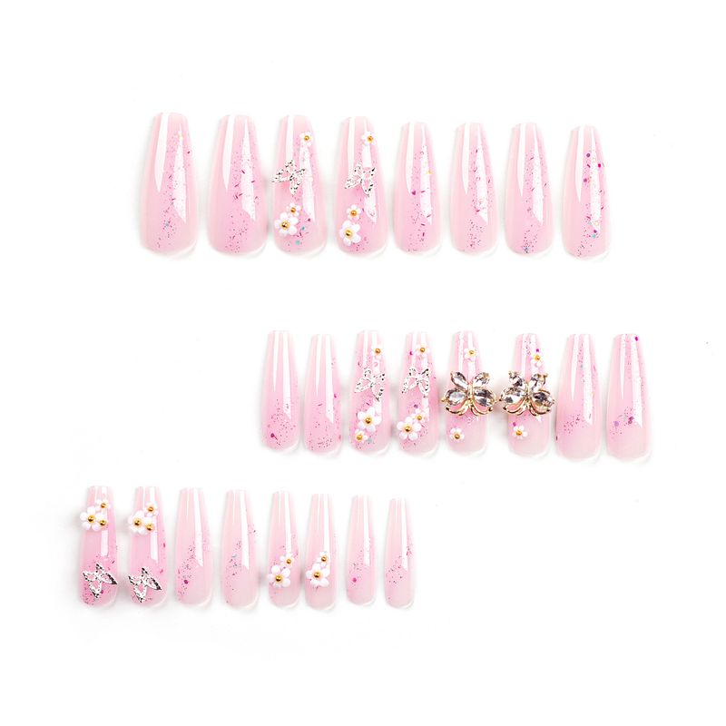 Sweet Pink Sparkling Pink Wearing Nail Flower Butterfly Explosive Sparkling Nail Patch Super Long Nail Patch False Nail
