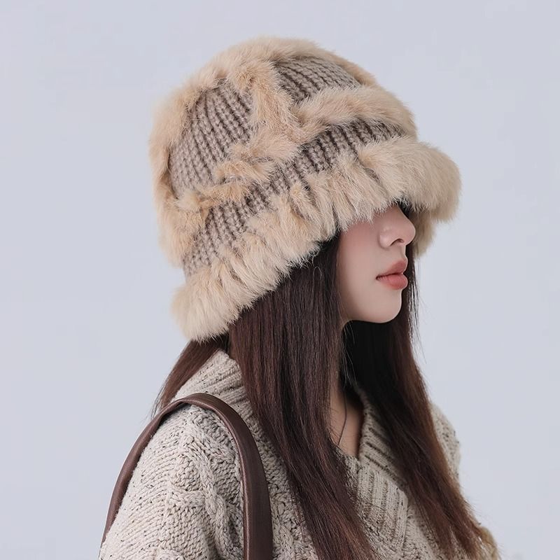 True rabbit hair knitted hat for women in autumn and winter, warm woolen hat, cold resistant plush bun, small fur fisherman hat that shows face