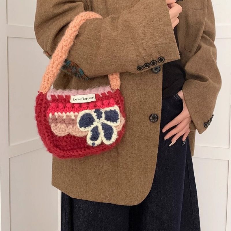 Korean version sweet woven butterfly knot yarn handbag for women, 2024 autumn and winter new cute and versatile knitted crossbody bag