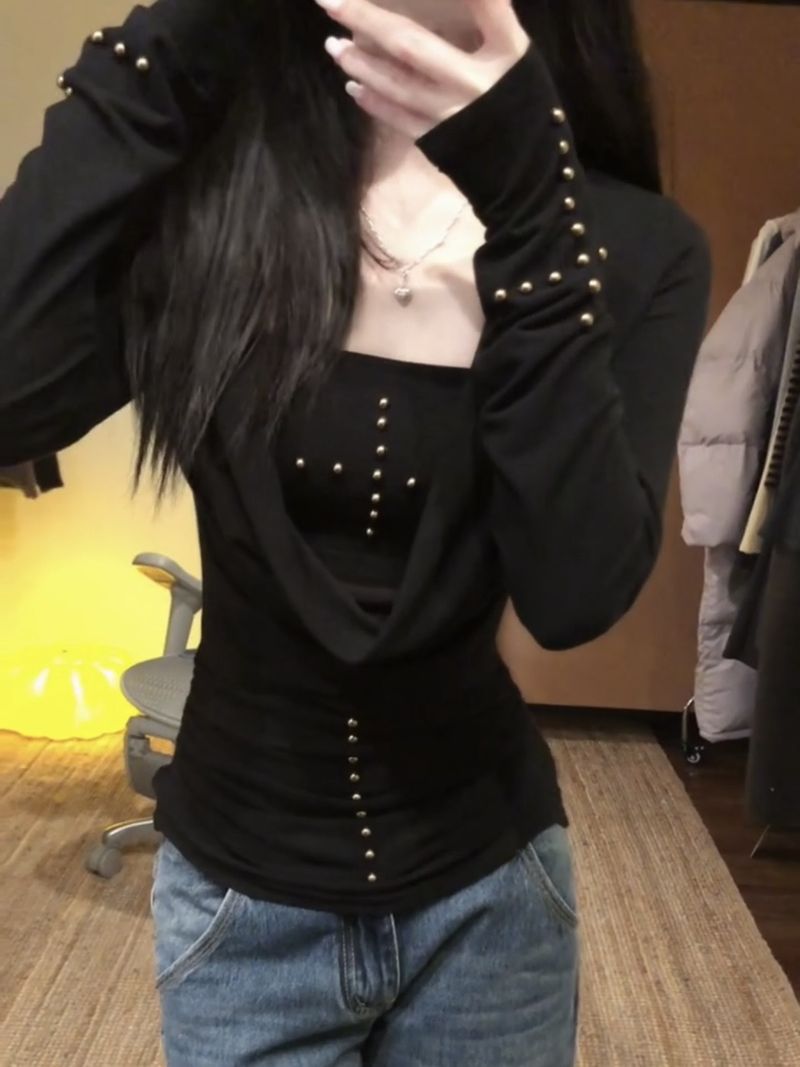 Versione coreana, stile punk rock, copricostume in maglia nera con rivetti, per donna, primavera e autunno, top corto Pure Desire