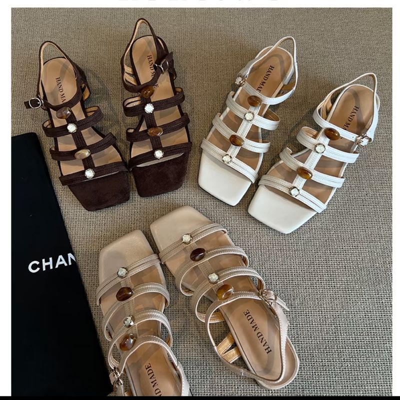 Versione in pelle di mucca ~ Sandali romani aperti con punta quadrata Old Money per le donne, stile estivo, nuovi sandali con tacco alto e cinturino singolo