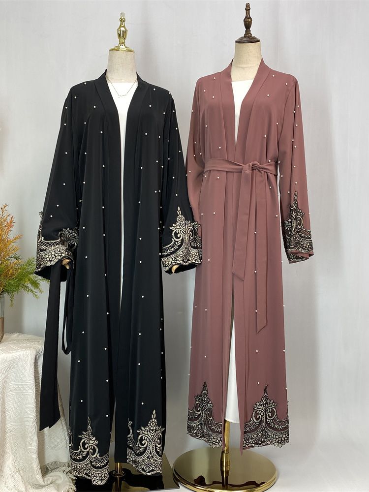 Vestiti da donna Abaya aperti in pizzo con perle, design alla moda musulmana, kimono lungo, kaftano, abiti islamici di Dubai per le donne