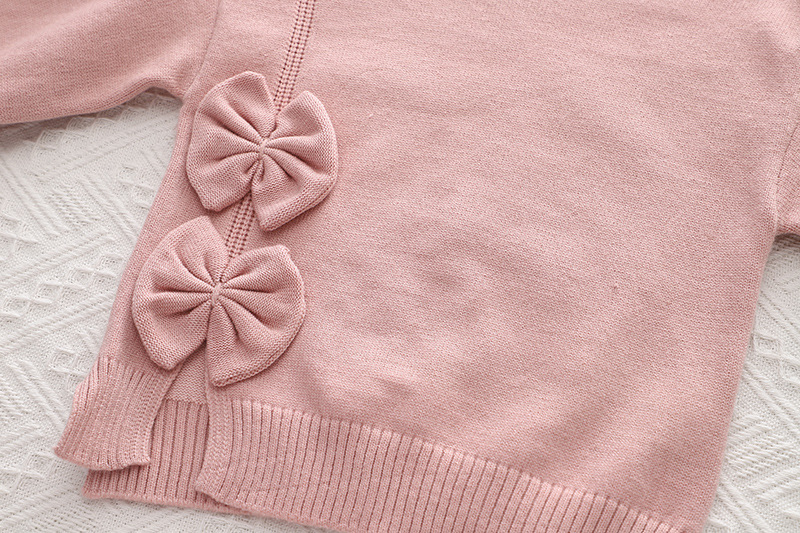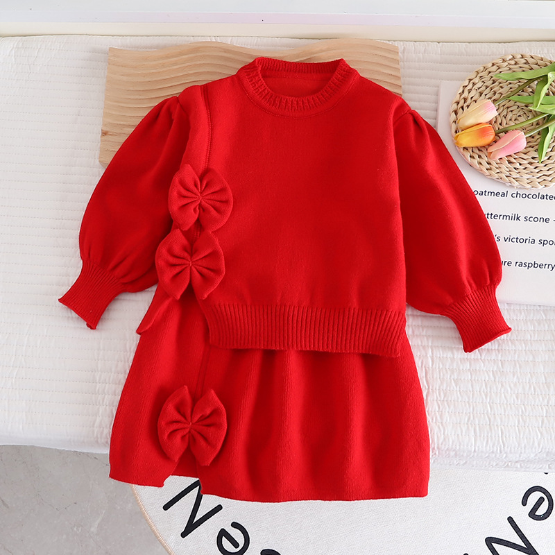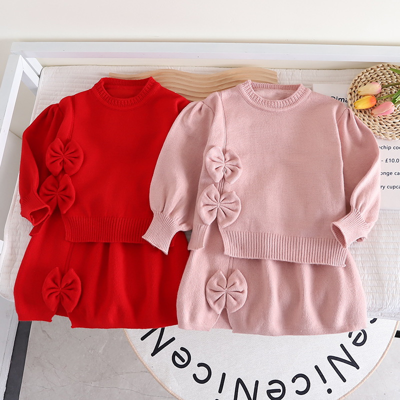 2024 Girls' New Knitted Sweet Bowtie Woolen Dress Two piece Set for Children's Autumn/Winter Short Skirt
