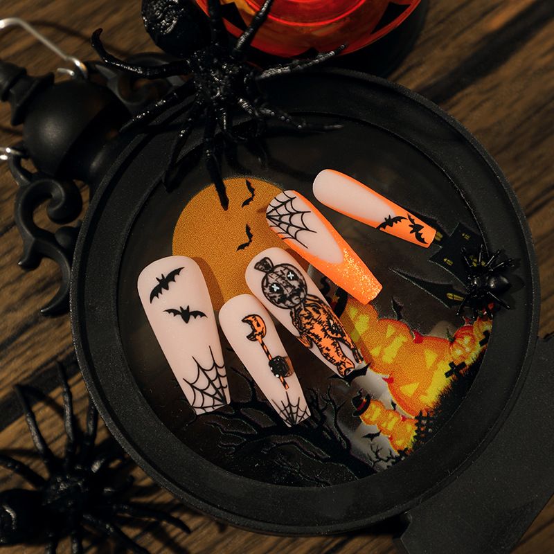 Wearable nail stickers for Halloween nail art orange French glitter pumpkin spider web bat nail art patches