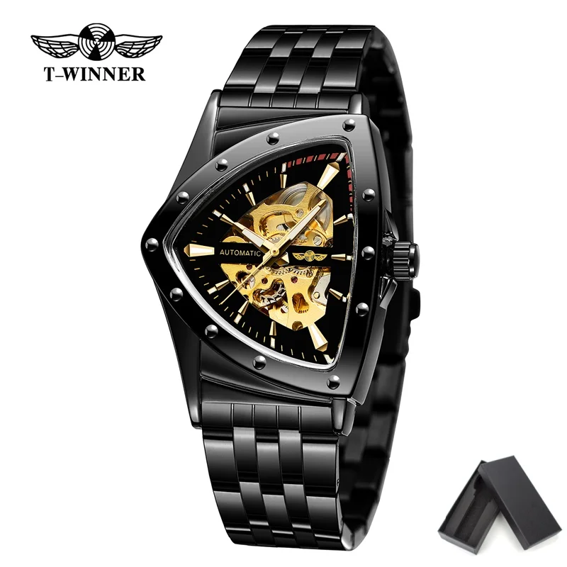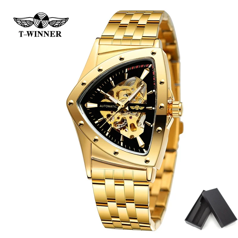 Winner 395S Nuovo orologio da polso meccanico da uomo in acciaio inossidabile dorato impermeabile sportivo da uomo con scheletro triangolare trasparente