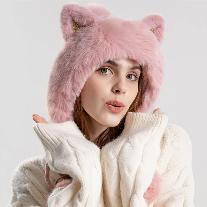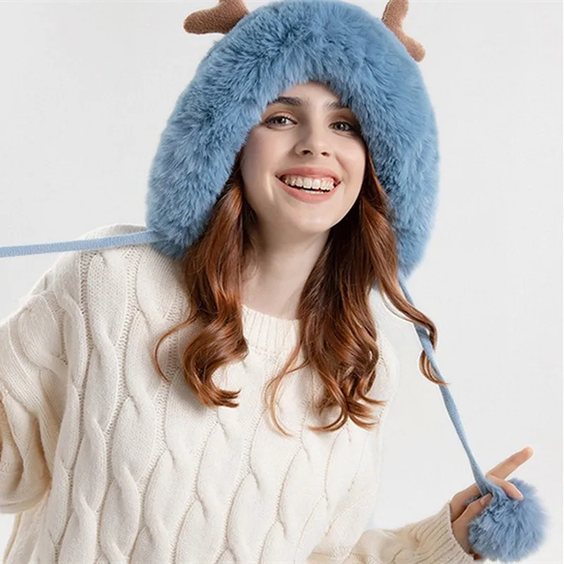 Winter Christmas Warm Knitted Hats Female Cartoon Deer Horn Two Balls Earflap Cap Plush Fluffy Thicken Fur Beanie Hat for Women
