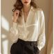 Camicia in raso di acetato verde di alta qualità, tinta unita, drappeggiata, unica nel suo genere, da donna