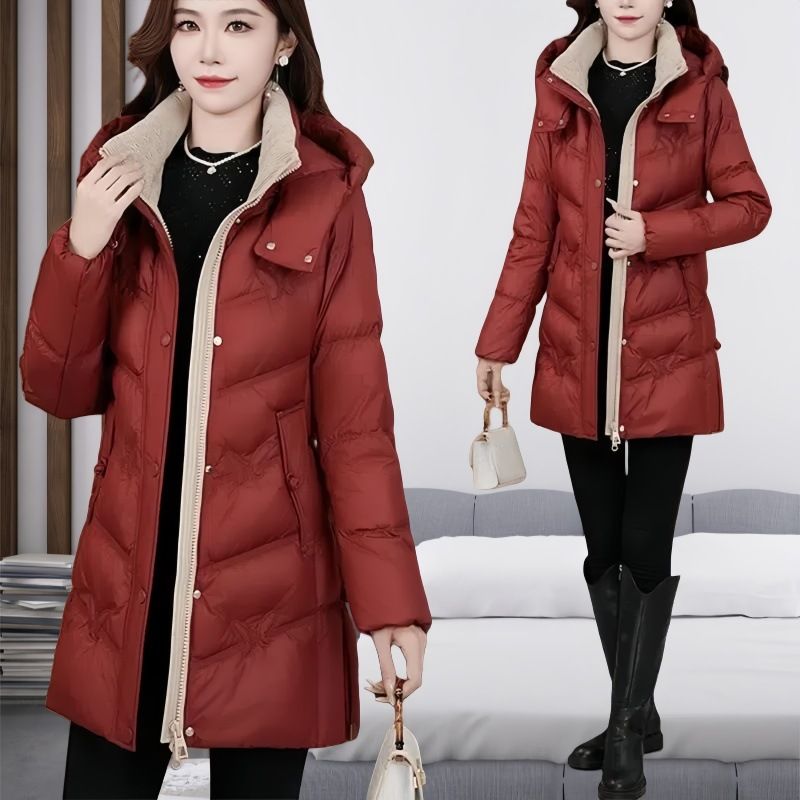 Piumino da donna di alta qualità, di media lunghezza, invernale 2025, nuovo, alla moda, elegante, spesso, caldo, con cappuccio in cotone