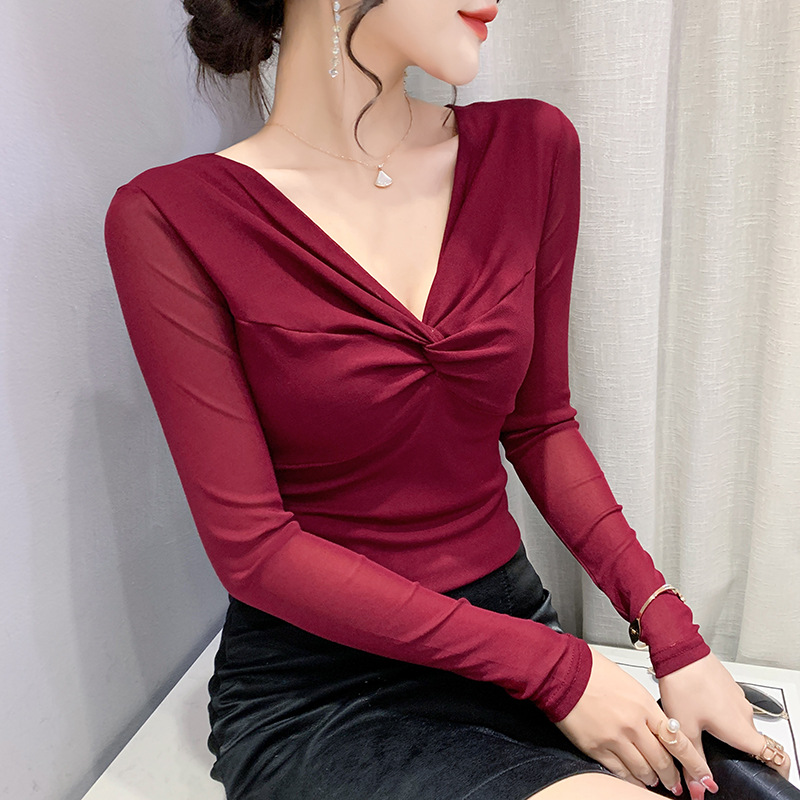 T-shirt da donna slim in rete a maniche lunghe con camicia slim a fondo incrociato