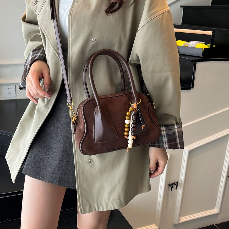 Zaino retrò in pelle scamosciata per donna 2025, nuovo zaino alla moda e alla moda con piccola catena di fragranze, borsa a secchiello multifunzionale