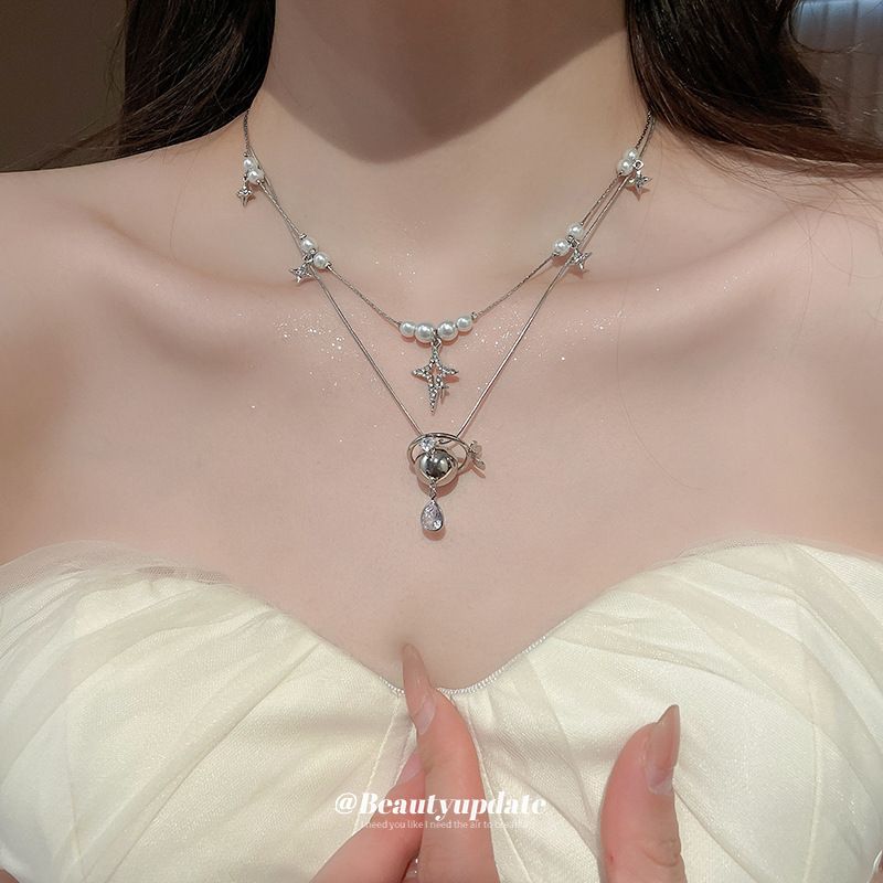 Zircone intarsiato con diamanti, perle di Saturno, collana a doppio strato, temperamento della moda di nicchia giapponese e coreana,